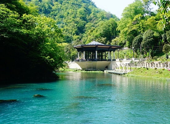 На берегу небольшого водохранилища, образованного плотиной ГЭС Новоафонского монастыря на реке Псырцха, в 1944 году был построен павильон на железнодорожной платформе. В разные годы эта платформа именовалась "Дача", "Агараки", а с 1967 году закрепилось название "Псырцха". В 1952—1954 годах платформа приобрела современный вид с круглым остановочным павильоном, который отлично вписывается в окружающий ландшафт, нависая над изумрудной водой рукотворного озера. Автор проекта — архитектор Георгий Лежава. Платформа расположена между двумя железнодорожными туннелями.