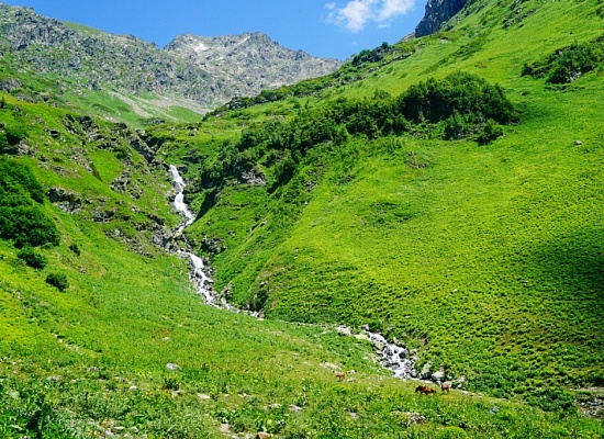 Переправляемся вброд через приток Ауадхары, образованный Нижним водопадом, и далее идем по тропе до реки: здесь тропа еще хорошо просматривается, потом теряется и практически исчезает в зарослях лопухов и рододендронов. К сожалению, в одном месте были еще заросли крапивы, которую пришлось «косить» палками, чтобы пройти. Если вам кажется, что по альпийским лугам можно свободно идти в любом направлении, то конкретно в этом месте не получится: путь преграждают буквально поля рододендронов, сквозь которые трудно искать проходы. Придерживайтесь карт MAPS.ME – на них тропа указана достаточно корректно.