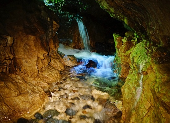 Пещера Холодная интересна, прежде всего, подземными водопадами. Поэтому, чтобы застать их не пересохшими, поехали в начале мая, да еще и после дождей. Но перестарались – пещера превратилась в один сплошной водопад: без веревок, сменного комплекта одежды и гермомешков далеко не прошли.