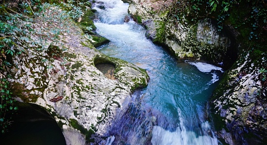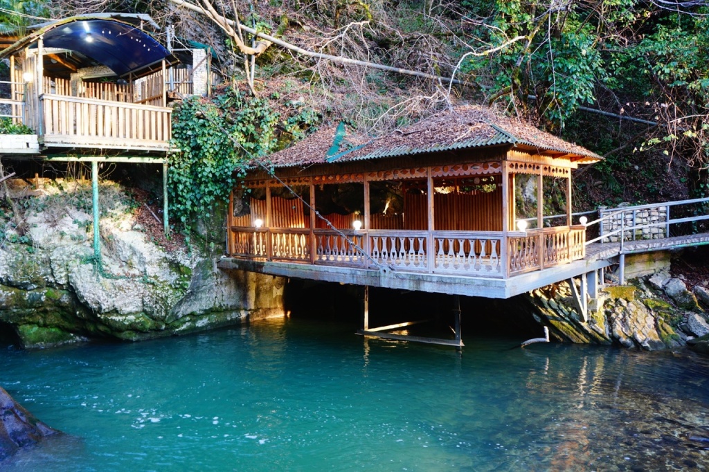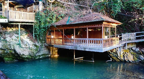 Координаты поворота с Военно-Сухумской дороги 42.991192, 41.165511. Далее, после моста, направо и все время прямо. Вход в комплекс - 43.019303, 41.18907. До поворота дорога асфальт, потом есть участки с ямами и щебенкой, но проходима для любого авто. Стоимость входного билета 300 рублей.