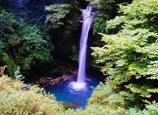 После брода вас ждет затяжной подъем. Ближе к его концу дорогу преграждают ворота, но их спокойно можно открыть, проехать и потом закрыть обратно. Координаты поворота налево 43.130976 40.951414. После поворота дорога ухудшается, начинаются промоины; в конце она упирается в небольшую ферму, это же и КПП на водопад. Стоимость посещения 300 рублей. Можно оставить машину здесь, а можно съехать еще чуть ниже до калитки, от которой начинается пеший спуск, - 43.127171 40.951865. Спуск довольно крутой; не оборудован и может быть скользким. В определенном месте он раздваивается на 2 тропы: направо первая ступень, левее вторая.