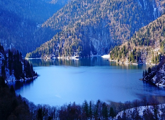 Пока на Рице толпились туристы: около елочки, цифр «2025», смотровой, кафешек - по дороге к даче Сталина и далее на Ауадхару была тишина. Можно было одиноко наслаждаться видами на озеро, окрестные горы, сугробы, спустившиеся со склонов.