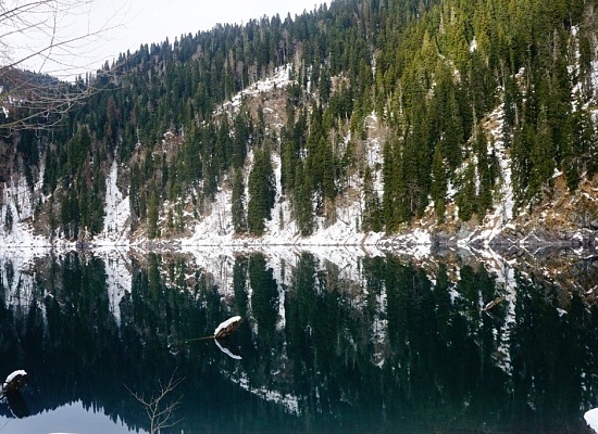 В каждое время года Малая Рица разная: весной и в начале лета изумрудная, осенью – темно-зеленая с проблесками желтизны, зимой оказалась черной с вкраплениями отражения белого снега.