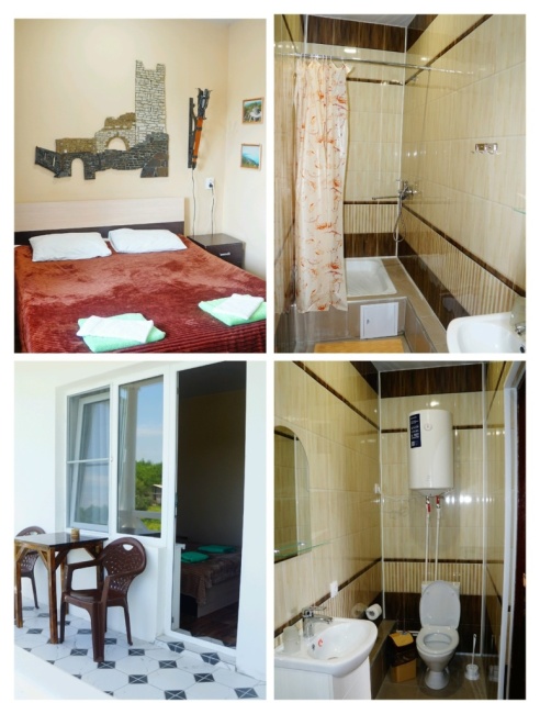 Двухместный номер с двуспальной кроватью и балконом. Площадь номера 14,5 кв. м. Площадь балкона 8 кв. м. В номере - комод, вешалка, 2 тумбочки, санузел (душ, туалет, раковина), кондиционер. На балконе - столик с двумя стульями. 2 этаж.