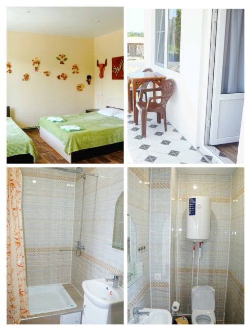 Трехместный номер с двуспальной кроватью и односпальной кроватью и балконом. Площадь номера - 22 кв. м. Площадь балкона - 9 кв. м. В номере - комод, вешалка, 2 тумбочки, санузел (душ, туалет, раковина), кондиционер. На балконе - столик с 2 стульями. 2 этаж.